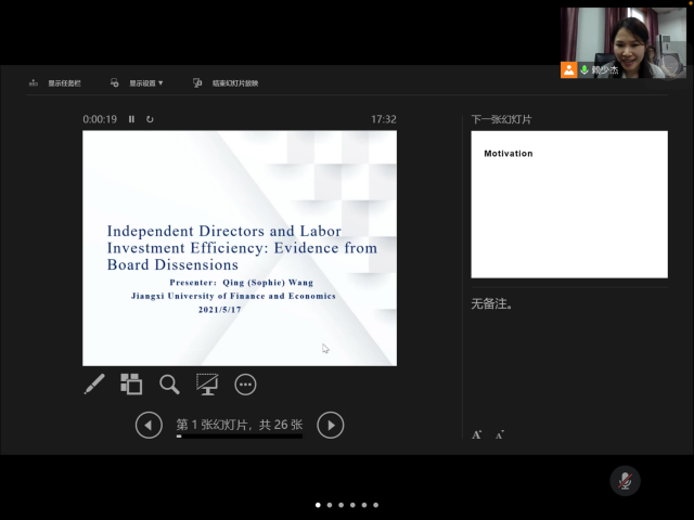 Then, Dr. Mingchen Sun shared his working paper It takes two to tango! New equity crowdfunding investor dynamics. The article is based on the dynamics of the number of new investors on the three major equity crowdfunding (Equity Crowdfunding, referred to as ECF) platforms in the UK, comparing the dynamics of the number of successful and unsuccessful ECF investors, and comparing the target capital financing period and the investors in the over-financing period of the successful ECF Quantity dynamics, compare the quantity dynamics of co-investment and traditional ECF investors. The results of the article show that from the dynamics of the number of investors, the successful ECF target capital financing period presents an asymmetric U-shape and a slowing U-shape of the over-financing period. The failed ECF is an L-shaped pattern; regardless of whether the ECF is a success or a failure , Co-investment and traditional ECF both have similar investor dynamics. Later, Professor Brain made a brief comment on Dr. Sun's thesis and put forward some suggestions for revision. Finally, Dr. Qing Wang shared his working paper Independent Directors and Labor Investment Efficiency: Evidence from Board Dissensions. The article studies the issue of whether independent directors will affect the efficiency of labor investment in enterprises, using the 2006-2018 data source CSMAR: independent directors' proposal voting and financial data. Through baseline regression, selection bias and endogeneity, sub-sample analysis, additional control, additional robustness testing and other methods, empirical conclusions can be drawn: The labor investment efficiency of companies with independent directors dissenting in China has been significantly improved; however, there is In a tie, the labor investment efficiency of enterprises is lower. Professor Brain made some suggestions on the use of vocabulary, analysis methods, residual measurement methods, and the focus of the article. The academic activity brand Corporate Finance Seminar has gradually become the academic business card of the School of Finance. This Seminar lasted for three hours. The high-quality academic interaction and academic confrontation stimulated by the seminars are conducive to improving the quality of working papers, broadening the research horizons of participating doctors, and greatly promoting the academic research atmosphere of the college.